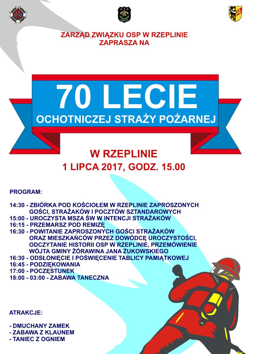 - 16:15 – PRZEMARSZ POD REMIZĘ 16:30 – POWITANIE ZAPROSZONYCH GOŚCI STRAŻAKÓW ORAZ MIESZKAŃCÓW PRZEZ DOWÓDCĘ UROCZYSTOŚCI, ODCZYTANIE HISTORII OSP W RZEPLINIE, PRZEMÓWIENIE WÓJTA GMINY ŻÓRAWINA JANA ŻUKOWSKIEGO