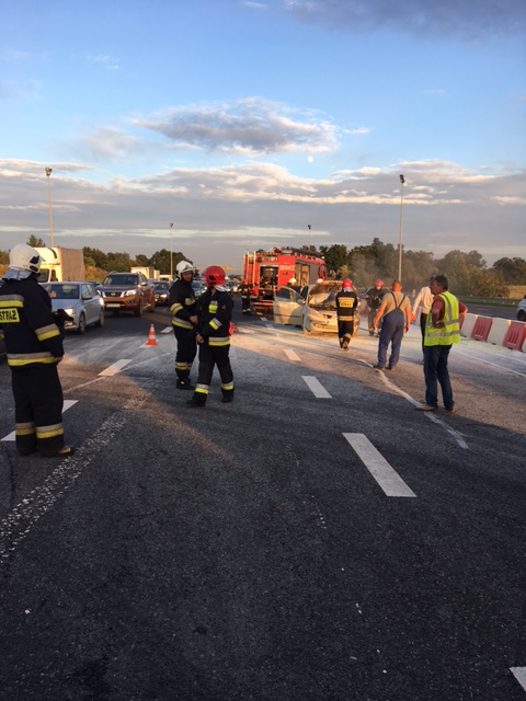 Do drugiego zdarzenia tego dnia wyjechaliśmy przed godz. 20:00. Na polecenie dyspozytora SK KM we Wrocławiu udaliśmy się alarmowo na autostradę A-4 (punkt poboru opłat w Karwianach), gdzie palił się samochód osobowy. W chwili przybycia zastępów PSP i OSP samochód osobowy Renault znajdował się na skrajnym lewym pasie dojazdu do bramek w kierunku Wrocławia i był gaszony gaśnicami proszkowymi przez osoby postronne i służbę autostradową.