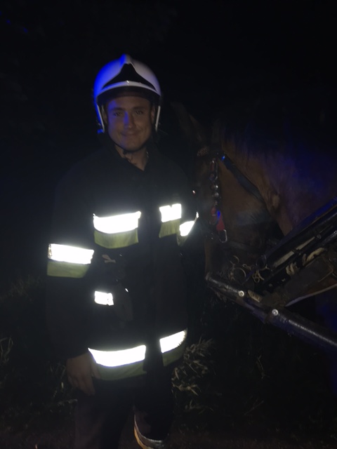 [dropcap]3[/dropcap] Trzecie alarmowanie tego dnia otrzymaliśmy o godzinie 23:07. Dyspozytor SK KM we Wrocławiu nakazał nam udać się alarmowo do miejscowości Domasław (gm. Kobierzyce), gdzie doszło do wypadku z udziałem bryczki konnej. Po przybyciu na ul. Parkową okazało się, że rzeczywiście doszło do wypadku dorożki konnej. Z niewyjaśnionych przyczyn, koń zjechał z jezdni wywracając się razem z dorożką. Poszkodowany woźnica został zabrany przez zespół pogotowia ratunkowego do szpitala. Działania strażaków oparły się na zabezpieczeniu miejsca zdarzenia, postawieniu bryczki na jezdnię oraz co najważniejsze opiekę nad koniem do momentu przyjazdu opiekuna. W działaniach oprócz naszego zastępu udział brali koledzy z OSP Kobierzyce oraz sekcja z JRG Kąty Wrocławskie.