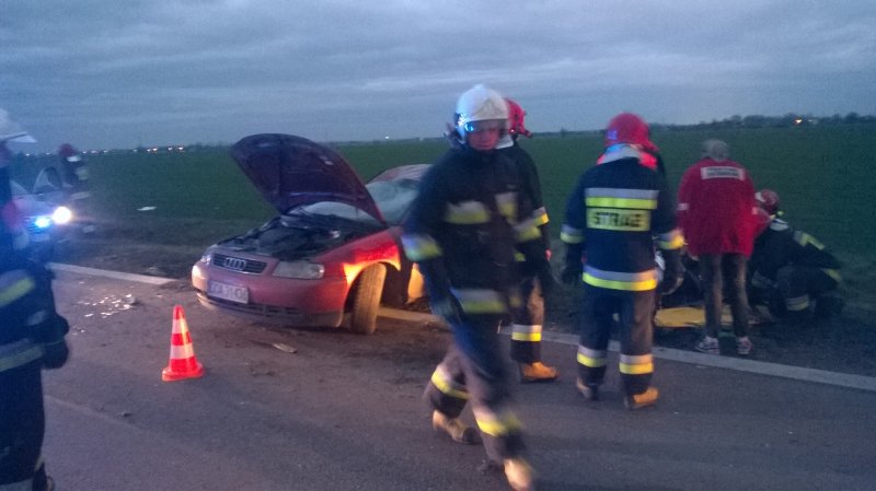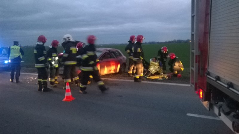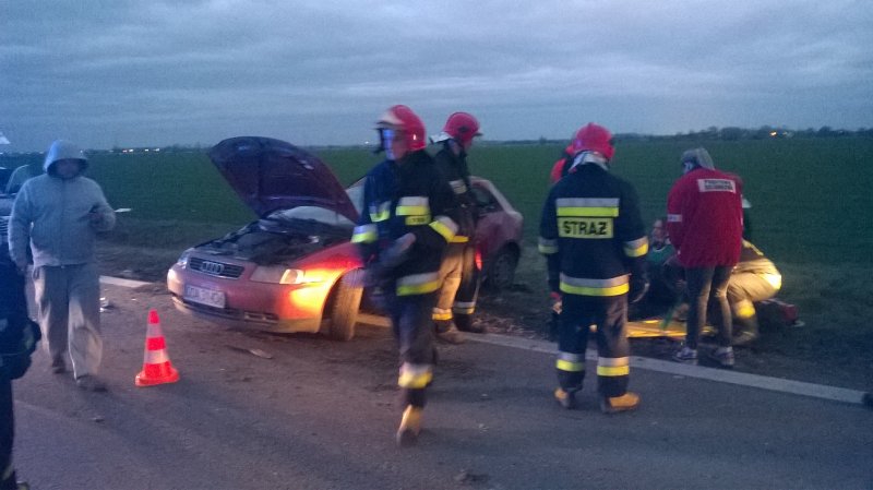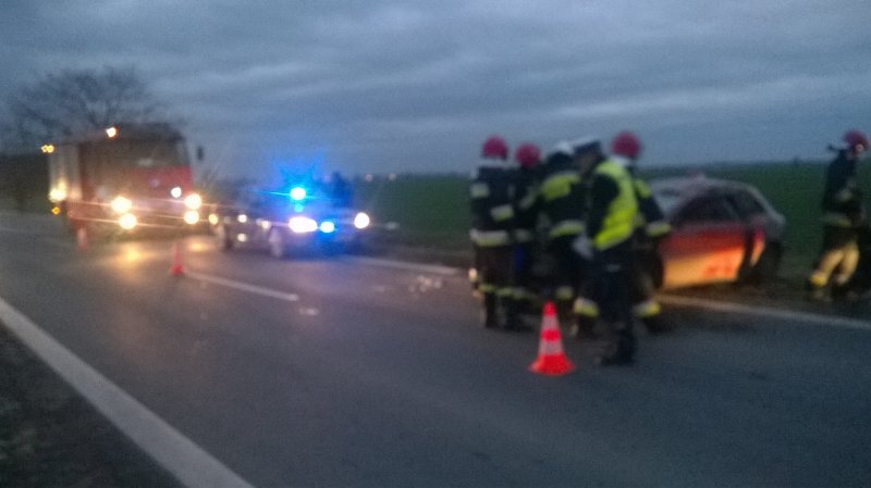 W dniu 28 listopada br. przed godziną 16:00 wpłynęło do naszej jednostki zgłoszenie z SK KM we Wrocławiu o dachowaniu samochodu osobowego na drodze wojewódzkiej nr 395 za miejscowością Turów. Po dojeździe pierwszych zastępów na miejsce zdarzenia KDR ustalił, że doszło do dachowania pojazdu osobowego, którym poruszała się kobieta. Kierująca znajdowała się po za pojazdem pod opieką strażaka z JRG 3 we Wrocławiu, który najechał na zdarzenie. Poszkodowana uskarżała się na ból pleców, doznała niewielkich obtarć naskórka okolic głowy i rąk, ponadto nie odniosła poważniejszych obrażeń. Pojazd znajdował się na kołach częściowo na poboczu, częściowo na jezdni, nie stwierdzono wycieku płynów eksploatacyjnych.